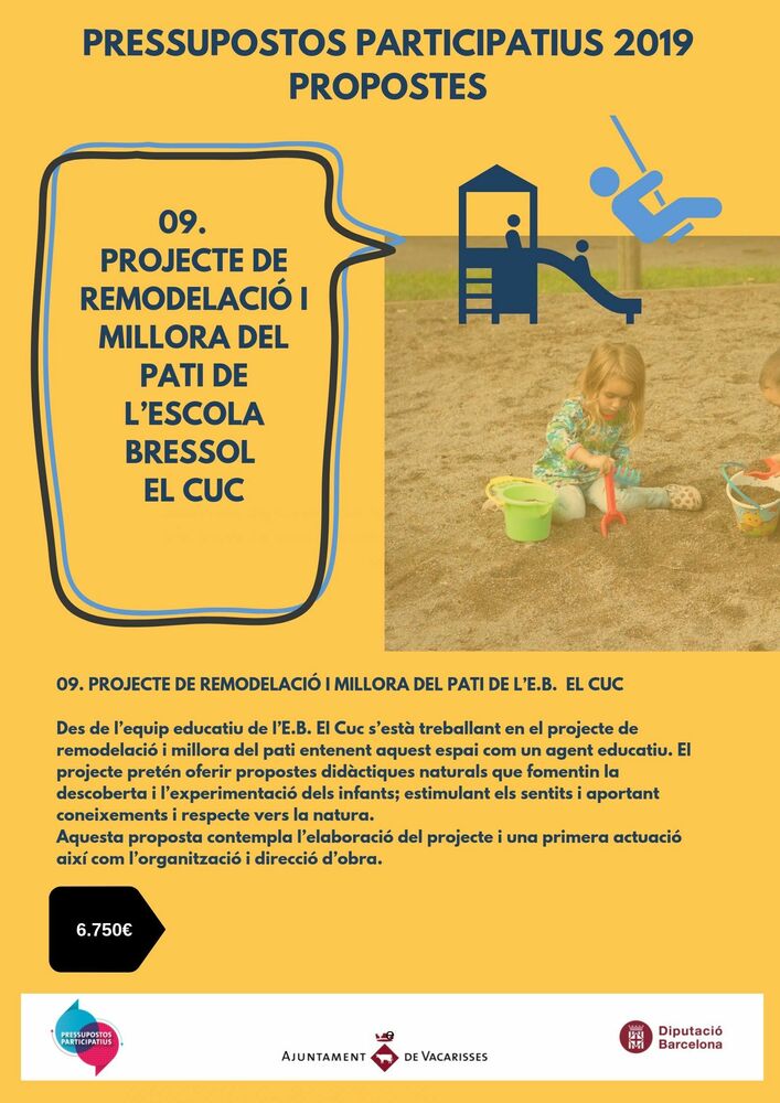 Des de l’equip educatiu de l’E.B. El Cuc s’està treballant en el projecte de remodelació i millora del pati entenent aquest espai com un agent educatiu. El projecte pretén oferir propostes didàctiques naturals que fomentin la descoberta i l’experimentació dels infants; estimulant els sentits i aportant coneixements i respecte vers la natura. Aquesta proposta contempla l’elaboració del projecte i una primera actuació així com l’organització i direcció d’obra. COST: 6.750 €