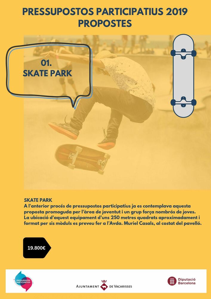 A l'anterior procés de pressupostos participatius ja es contemplava aquesta proposta promoguda per l'àrea de joventut i un grup força nombrós de joves. La ubicació d’aquest equipament d’uns 300 metres quadrats aproximadament i format per sis mòduls es preveu fer a l’Avda. Muriel Casals, al costat del pavelló. COST: 19.800 €