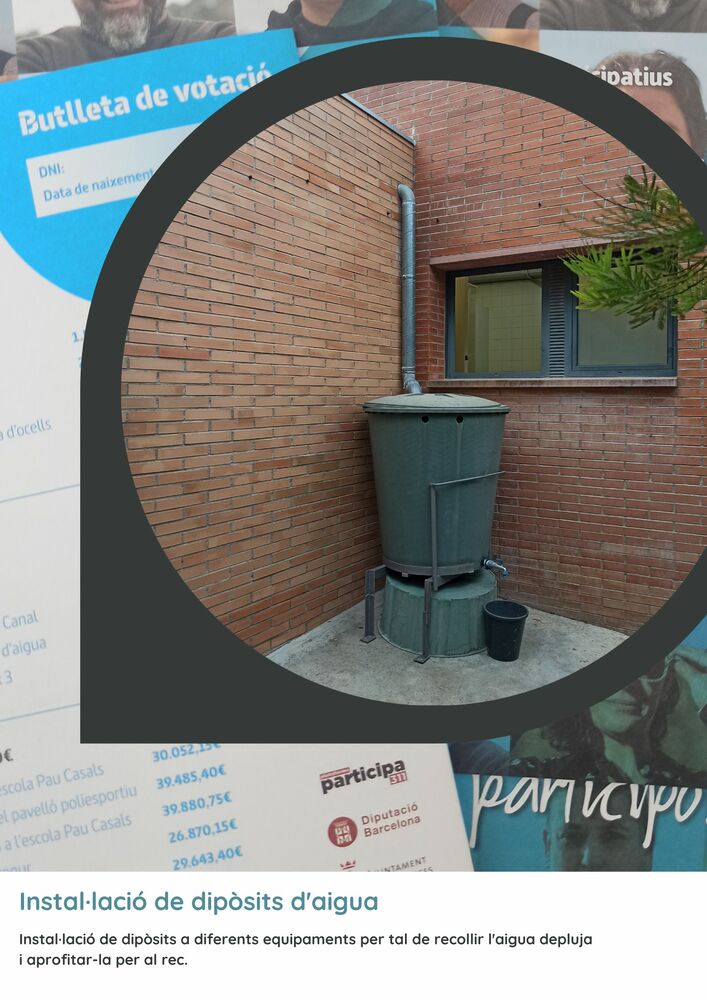 Instal·lació de dipòsits a diferents equipaments per tal de recollir l'aigua de pluja i aprofitar-la per al rec.